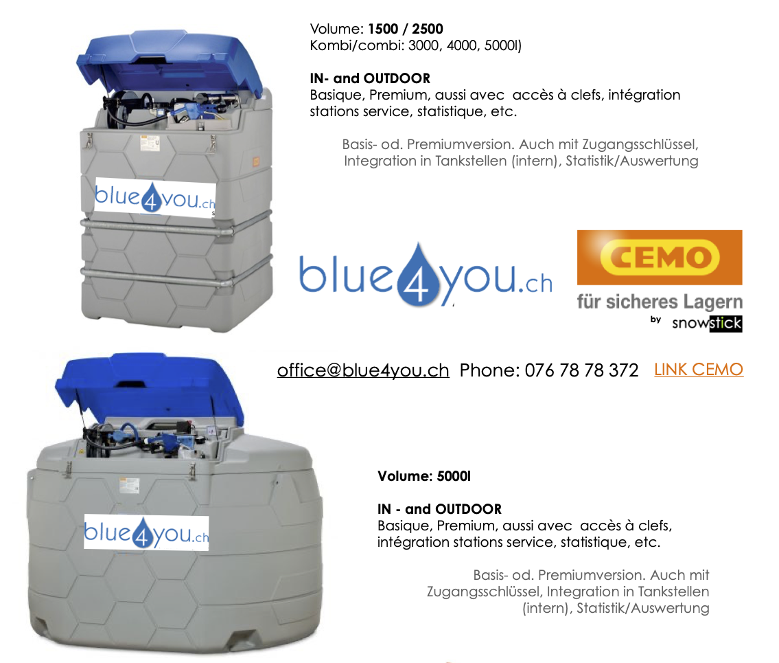 1000l IBC-Container, 200l Fässer, Kanister 10l. Grossmengen auf Anfrage. Zubehör, Tankanlagen CEMO, Pumpen, Schläuche, Zapfpistolen, etc. Produkteprogramm CEMO
